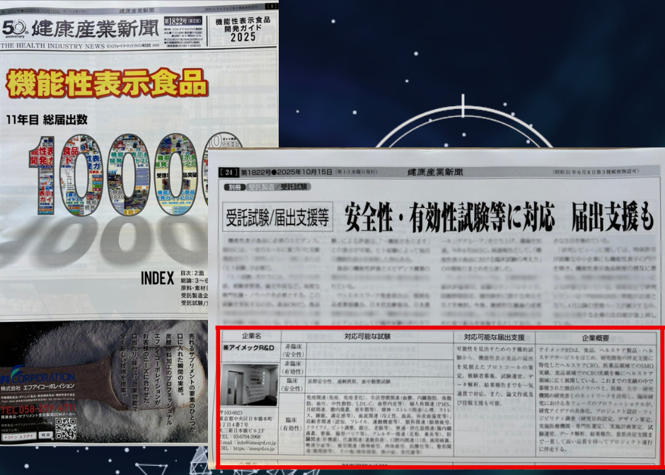 このたび、健康産業新聞 2025年10月15日発行<第1822号(Ⅲ部)>機能性表示食品開発ガイド2025に当社の記事が掲載されました。