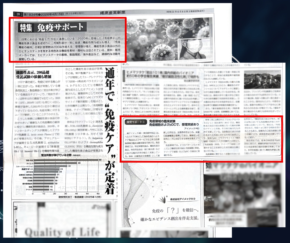 このたび、健康産業新聞 2026年4月15日発行<第1834号>特集【免疫サポート】に当社の記事が掲載されました。